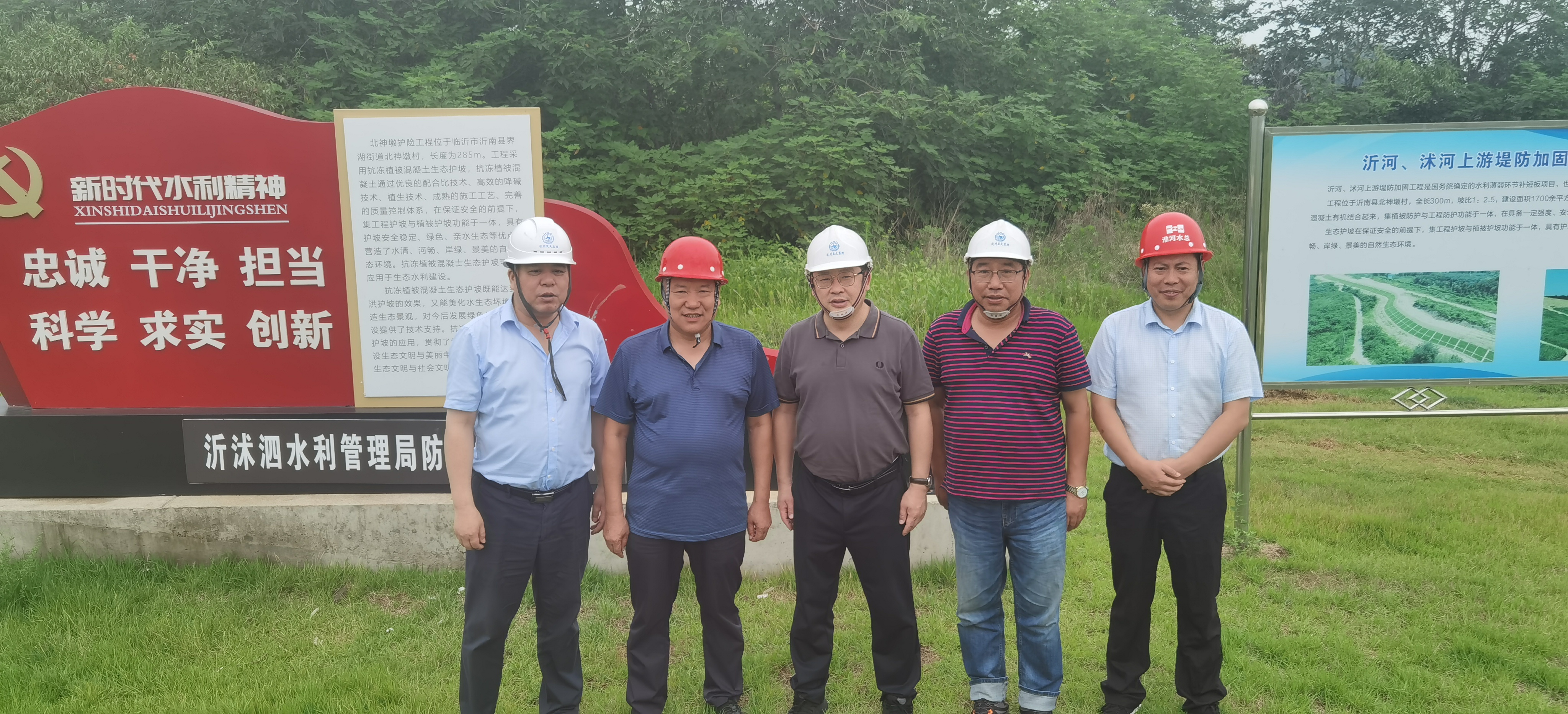 沂河沭河上游堤防加固工程監(jiān)理1標(biāo)段是我公司于2020年中標(biāo)的項目。項目建設(shè)受疫情影響進(jìn)展比較緩慢,目前主體工程基本結(jié)束,正處于后續(xù)收尾階段。徐志峰所長以“四不兩直”的方式,自行乘坐高鐵來到臨沂,驅(qū)車3個小時直奔沂河上游工程現(xiàn)場。雨后的大堤上分外悶熱,氣溫直逼40ºC,徐志峰所長要求大家不管天氣多么炎熱,一定要戴好安全帽,時刻繃緊安全生產(chǎn)這根弦;并與工程建管局領(lǐng)導(dǎo)現(xiàn)場深入交流,虛心請教大堤新型草皮護(hù)坡施工工藝,同時提出了自己的想法和建議。